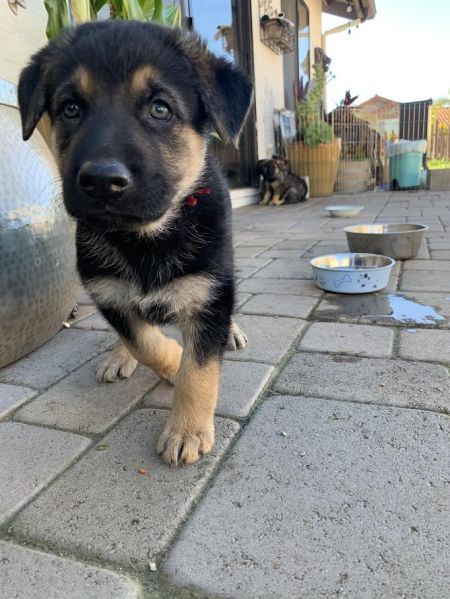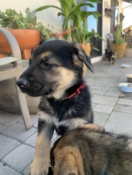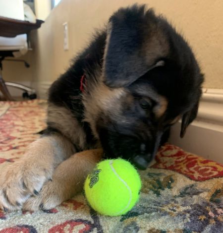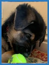 Adele is a black and tan German Shepherd. Based on the puppies' appearances, we think that the dad was a full or partial Sable GSD. Aidan has the black and tan coloring of his mom. He loves his ball and he is very good-natured pup.