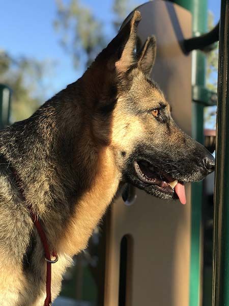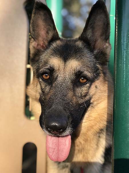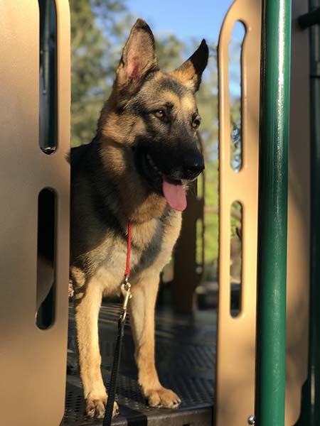 While she can be timid around new people, she warms up to you given some time and structure, is potty trained, and knows her basic commands. Kids would be too overwhelming for her, so Apple is looking for a family with no young children and GSD experience.