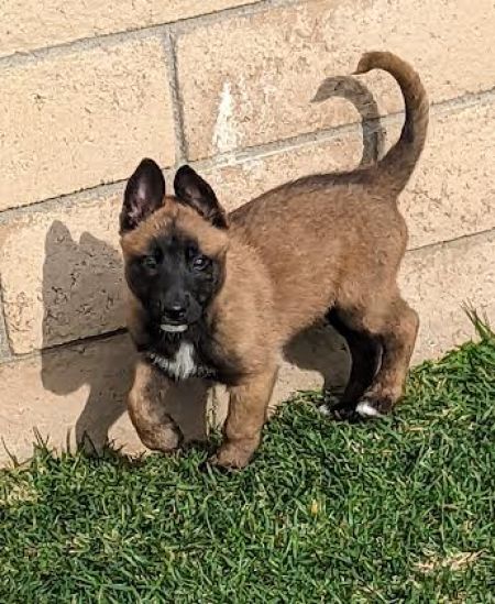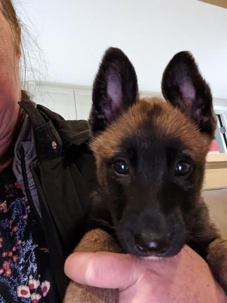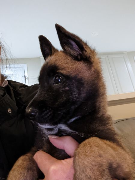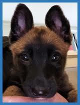 Most of the puppies, including Atlas, look like dark colored Malinois like their mom. Atlas will be a "Velcro" dog. If you are Looking for a buddy who's always game and wants to be with you 24/7 then Atlas is your guy. He'd prefer to be touching you all the time.