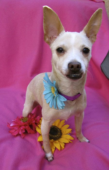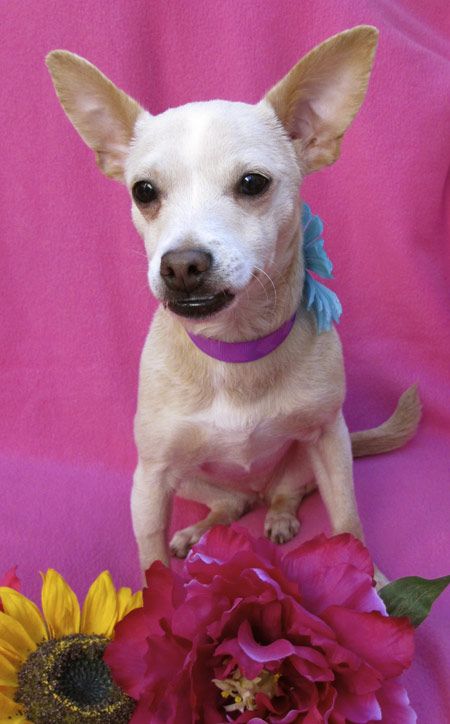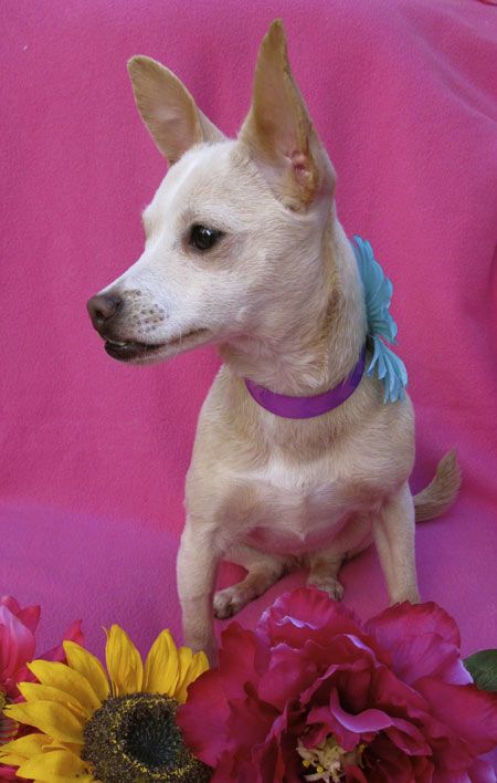 She's a "Deerhead Chihuahua" and only 7 lbs, but lives with 3 big dogs and gets along with dogs of all sizes. She loves to snuggle and is crate trained.