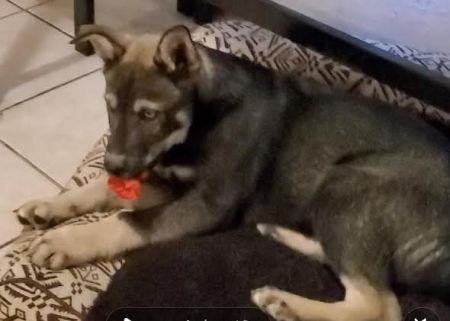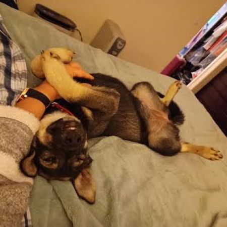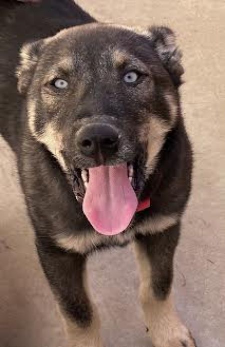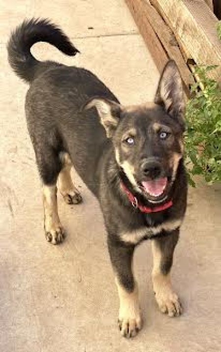 Hound running down the street in front of the Humane Society in Barstow. Good Samaritan found her, took her to the vet and got her first puppy vaccinations.