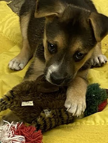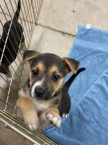 Benji and Bumper look and act a lot alike but you can tell them apart because Benji does not have a white spot on his nose. Bumper does. Benji is a sweet boy who enjoys playing with his smaller siblings and being cuddled. He is a typical little puppy who likes toys, exploring, and snuggling.
