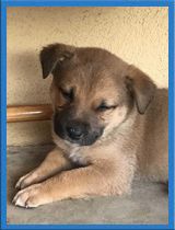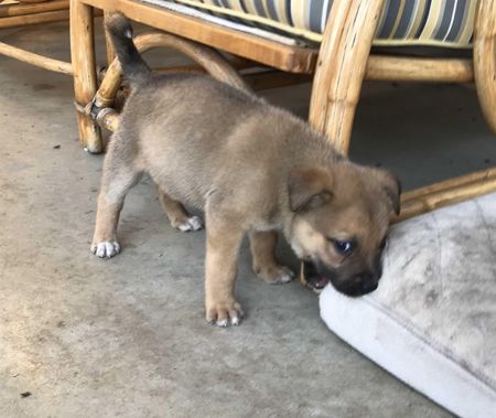 He is 8 weeks old and looks very angelic but he is a rough and tough little boy. He lives with two large German Shepherds and will play with them until they have enough and say "uncle." He loves to play out in the yard and can entertain himself and he also loves to play ball. He is crate trained and potty trained. He is a busy boy but will put himself in his crate when he needs a nap. He is a climber and will climb the baby gate or just knock it down if he wants to be in the next room. He taught himself to walk up and down stairs. He is very smart. We recommend that Bosco go to a home with another playful, active young dog. He is not going to do well cooped up in an apartment so a house with a yard will make him and you happy. We do not recommend that he go to a home with young children.
