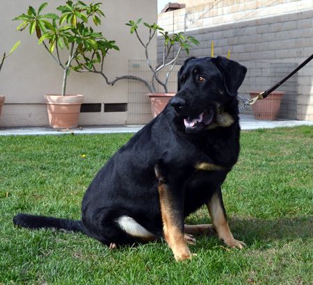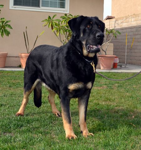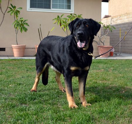 If you're looking for a huge (and we do mean huge) sweetie, meet Boss! We believe he is mostly Rottie and maybe half teddy bear. As "soft spoken" and as cuddly as they come, Boss tips the scales at 130 lbs. We don't know what happened to Boss before his rescue, but he is scared of direct contact with men whom he doesn't know (although, we're working on that and he's made some progress). At this point, he'd do best with women who understand he needs time to adjust.