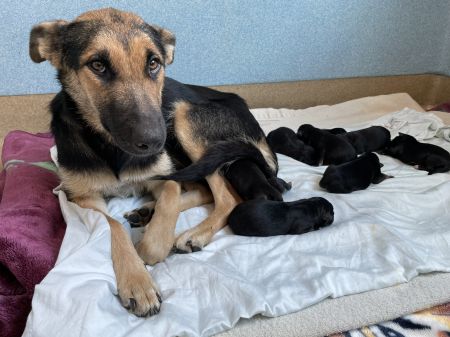 Mom Blossom (photo included) is a German Shepherd mix and is approximately 50 pounds. Her babies are mixes as well and we think their primary breeds are German Shepherd and possibly Australian Shepherd based on their coloring and features. Some of the puppies have long tails like a GSD and other have short, bobbed tails.