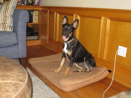 "Bucket" went to her foster home with her two babies - Bert and Balto. The puppies were just days old and when the foster mom received mama and her babies, she put the babies in a bucket (with a blanket inside) while she got their room ready. After that, mama was called "Bucket". She is a great dog with an funny name. She is a young mother and is very happy and playful. She gets along with all dogs and people. She is house broken, crate trained and walks great on a leash. She is the best mama dog that the foster has had and she has fostered quite a few.