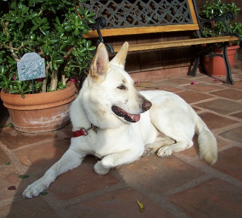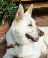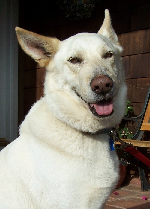 Buddy is a sturdy, attractive, medium-sized White German Shepherd. He’s dignified and calm, but also very playful with his foster siblings. His foster mom is helping him watch what he eats so he’ll be in perfect shape for his new family. He’s non-dominant, crate-trained, and gets along well with other dogs, both girls and boys. Gentle, patient, cooperative, and affectionate, Buddy is also good with small dogs (he lived with one in his early years) and small children (his foster mom has a four-year-old granddaughter). He could use a little refresher on his obedience training, but his manners are really quite nice. His foster mom says he’s an easy dog to have around.