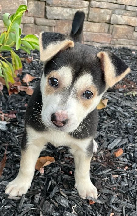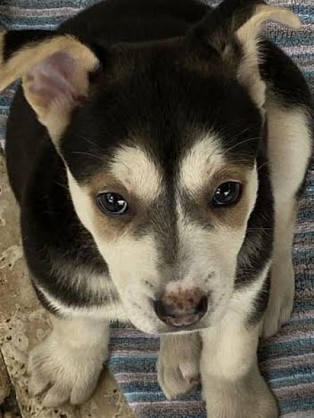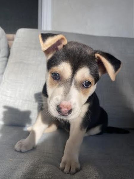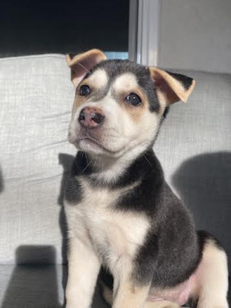 The mom is a Husky and German Shepherd mix. We aren't sure what dad was. Bugsy primarily has German Shepherd coloring but also some Husky features around her face. She weighs 10 pounds and is 8 weeks old. She is a confident, fun-loving girl. She loves to play with dogs larger than her and explore around the bushes in the backyard. Though she is an active girl, she can quiet down and snuggle with the best of them.