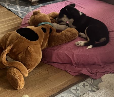 When Bulleit came to us, he was one of the thinnest puppies. He is eating several small meals a day and slowly putting on weight. He likes to wander around the foster family's yard and explore. Following his explorations, he is very happy to sit on the couch with his foster dad and nap. He can use a dog door and takes himself outside to go potty.