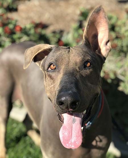 Cameron was picked up as a stray by animal control and then found himself a resident of the San Bernardino City shelter. We don't know his past, but he was missing 99.5% of his hair when we rescued him and sent him to our vet in March of 2019. One biopsy and one dermatologist visit later, it was determined that he had an antibiotic resilient infection that would require some specialized care to resolve. He continued to see his specialist, received medicated baths, as well as medication, and turned the corner, but remains hairless. He has a fine layer of baby-like hair and his legs have more, making it look like he's wearing Uggs. He's been medically cleared and is now completely healthy, but we don't know if he'll ever have a full coat. Maybe he's a GSD/Xoloitzcuintli mix? Maybe he's just starting a new trend!