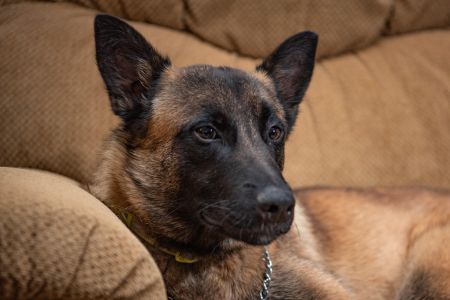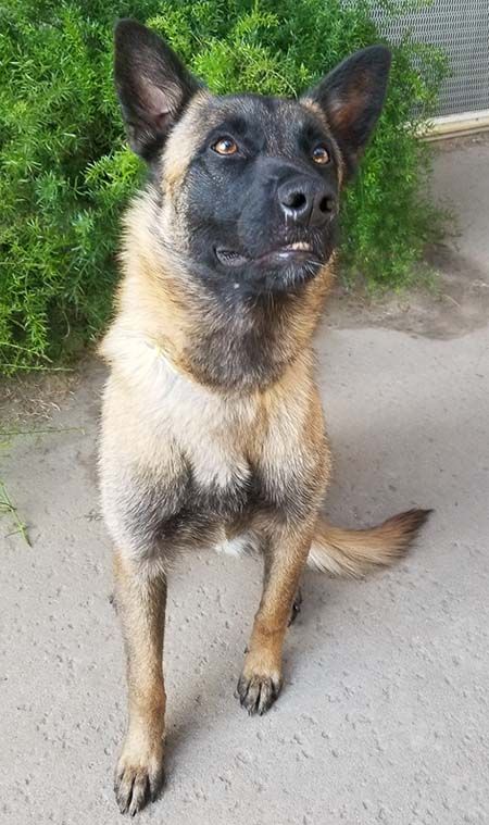 This beautiful 1-2-year-old Malinois was left in front of a barbershop. She previously lived with a poodle and is good with children. How do we know this? Well, the people who saw her hanging around the barbershop searched for and found her owners, who said they didn't want her anymore. They had left her there with a ball, a can of tuna, and some eggs.