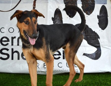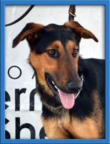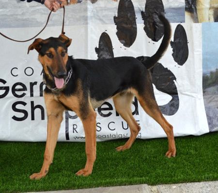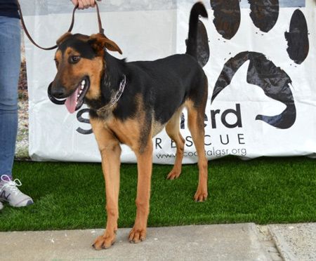 At his very first adoption event, he was handled by an 11 year old with ease and just fell for anyone who gave him attention. Cooper is a shepherd mix and we are guessing some dobie in him due to his long legs & long body.