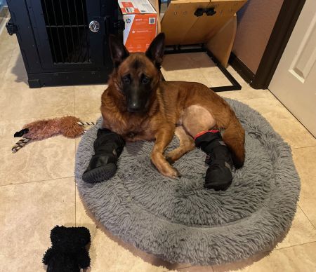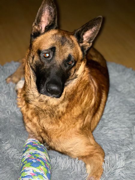 Cougar is a beautiful dog who comes to us with a story that will break your heart. In an attempt to re-home Cougar and another dog his previous owner gave both dogs to someone who wasn’t able to provide a secure home. The dogs ran into the street where they were both hit by cars. One dog didn’t survive and poor Cougar, severely injured with 2 broken legs, laid beside his deceased buddy on the side of the road. Animal Control picked up Cougar, who was crying in extreme pain, and brought him to the shelter. Cougar sat in the shelter for days while his owners refused to return calls from the shelter with Cougars pleas for help. When his time at the shelter ran out, they contacted Coastal German Shepherd asking if we could please provide Cougar with medical care as he was still in extreme pain. Our amazing crew jumped into action and rescued Cougar, got him into a secure foster home where he was brought into surgery the following day. The surgeon told us Cougar's injuries were at least a month old, meaning Cougar must have been laying on the side of the road for quite some time - Unbelievable! Cougar has had both legs repaired and has become quite the superstar with everyone he meets. His recovery will be a very long and very expensive process - but we are determined to give this beautiful dog the life he deserves. It’s been 5 weeks since his surgery and he still can’t walk, but his kind and friendly spirit shine through. He has become quick friends with all his new buddies at his foster home and with all the love and support that heaven allows, we are hopeful he can be back on the walking trails sometime in January. Go Cougar!