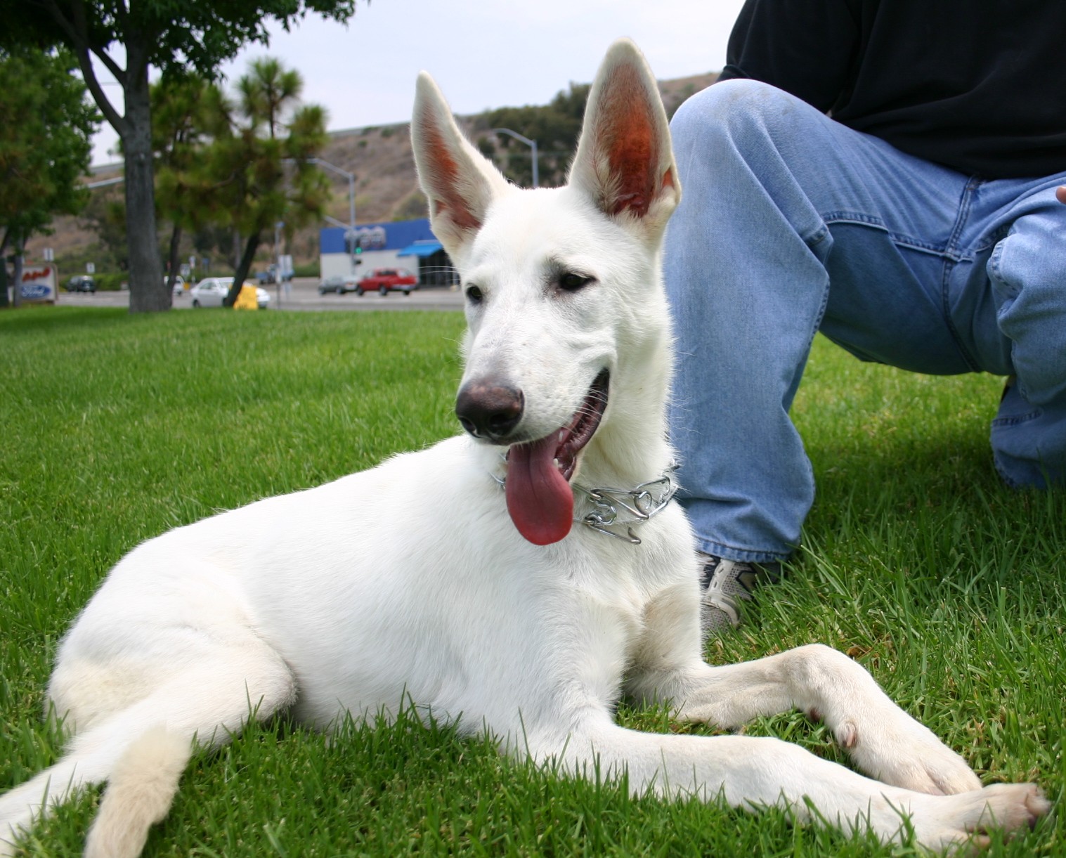 This adorable 9-10 mo old white fellow was found stray on the streets of Santa Monica and never reclaimed. He got to have an overnight in a foster home and was the perfect gentleman. Dallas has some BIG ears to grow into and we think he'll be an average sized boy once he is done growing.