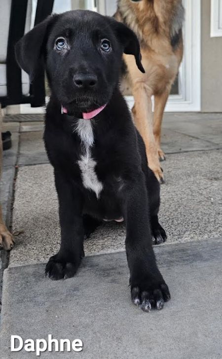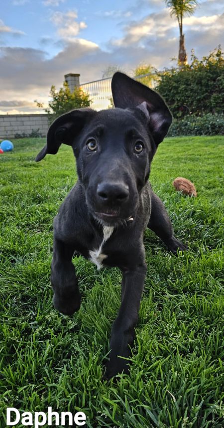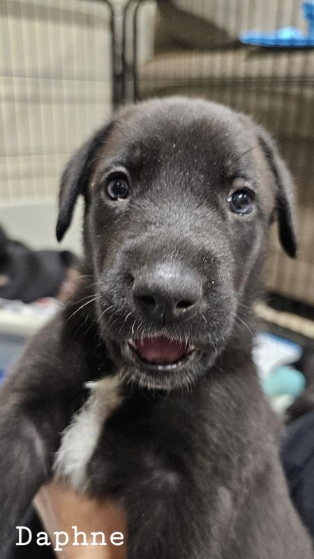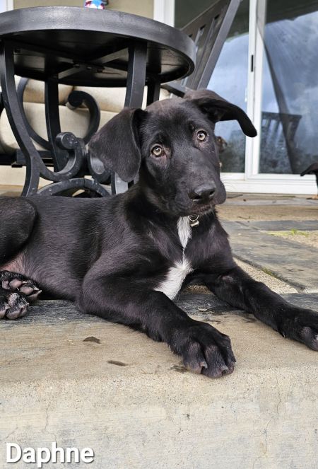 Daphne is a black puppy with a white chest. She knows she looks good, especially when she wears her pink collar. Daphne is very sweet and loves people. She also likes being with the other dogs in the household and being outside. She would do well by herself or placed in a home with other dogs.