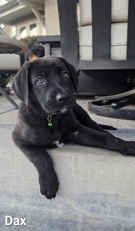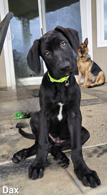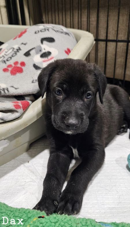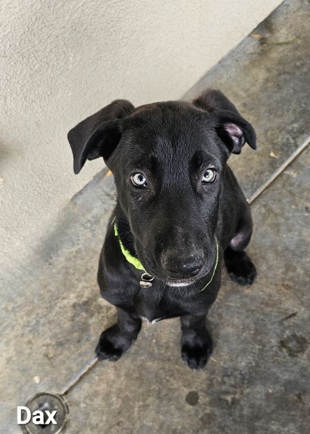 Dax is an all black puppy with a splash of white on his chest. He is a cool guy who likes to hang out, play with toys, and do some yard exploration. Dax would do well by himself or placed in a home with other dogs.