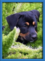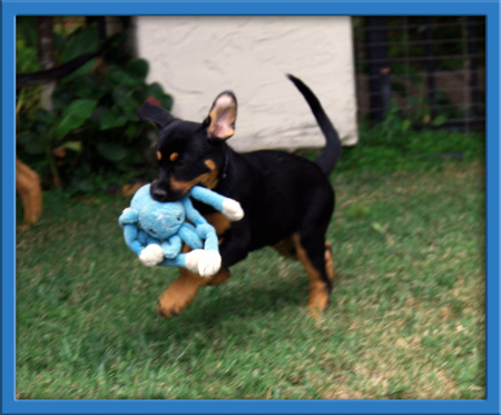 Now weaned and enjoying some independence, Dakari's 5 boys and 8 girls are almost ready for homes of their own. They love to explore, play with their toys and rough house with each other. They also enjoy the company of the big dogs in their foster home. They love to initiate play through the fence of their puppy area and a game of follow the leader is always fun! They are also very people oriented and love to be petted and played with.