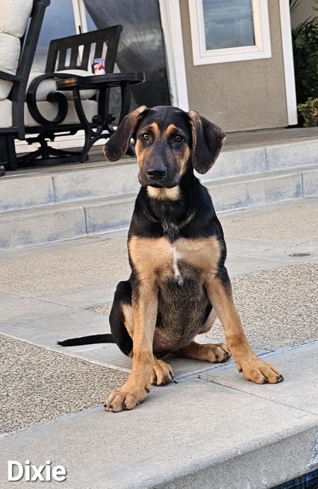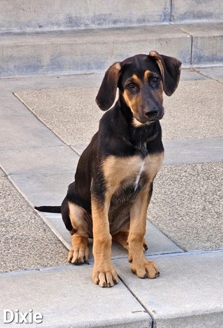 Dixie is a pretty black and tan pup. Her portrait does not do her justice. She, along with her brothers Dash and Dexter, is one of the sweetest puppies in the litter. Dixie would rather be with hanging out with her people than with other dogs, though she does just fine playing with the other canines. Dixie would do well by herself or placed in a home with other dogs.