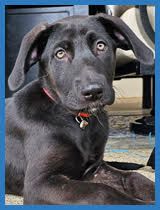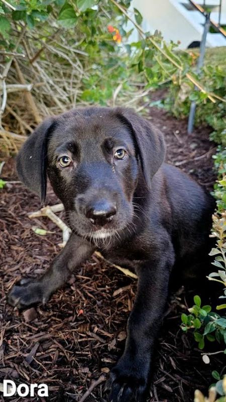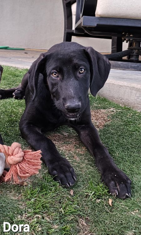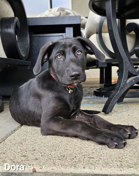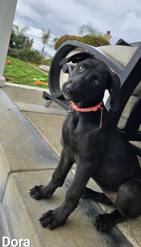 Dora is a pretty black puppy with a white chest. She is sweet, a little bit independent, and a friend to all dogs. She loves playing with her littermates and siblings in the back yard. Dora would do well by herself or placed in a home with other dogs.