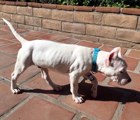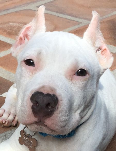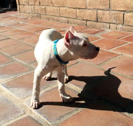 We believe Duke is a purebred Dogo Argentino, also known as an Argentine Mastiff. A somewhat rare breed in this country, they are quite popular in their homeland where they do everything from guarding sheep or cattle, hunting big game, to guarding and playing with the family’s children as treasured house pets! Duke should grow up to be a very big boy, somewhere in the neighborhood of 110 lbs, the breed standard for an average adult male.