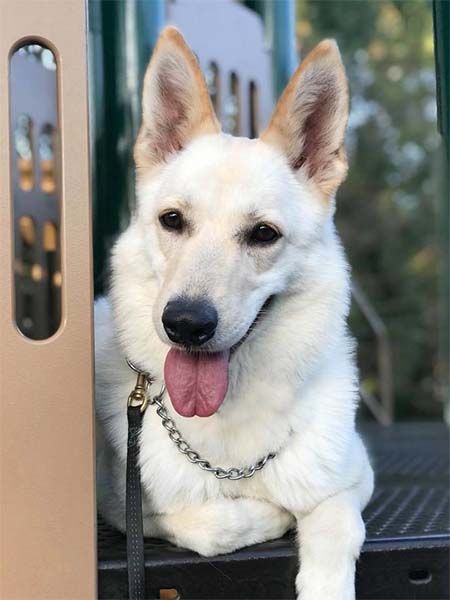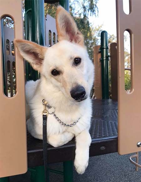 Elke is 2½ years old and the offspring of Apollo and Gretchen (who are also both available for adoption). Their owner was a backyard breeder who was not able to care for Apollo, Gretchen, nor the H litter, so Coastal GSR took them all in. We leave no dog behind. 😉