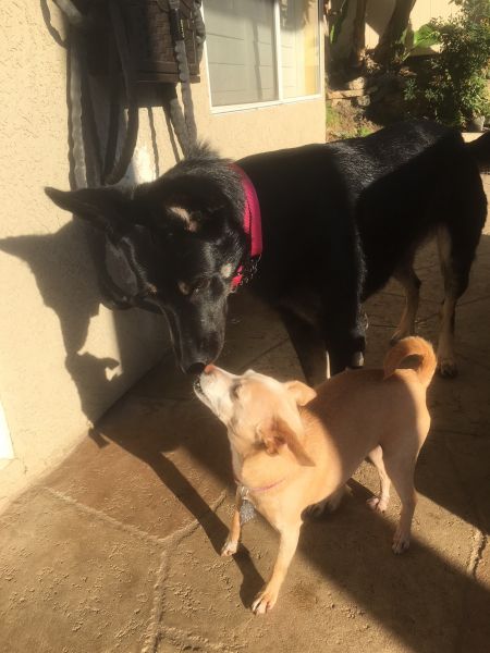 She has not been tested with cats, but she has no reaction whatsoever to a 10-lb Chihuahua, so she might be ok with cats. She had some scabbing on her hocks, most likely due to an attack by other animals, but surprisingly isn't defensive or aggressive around the other dogs in her foster home. She is slowly warming up to them, but was initially a little overwhelmed, which makes sense after her history. Ella likes going to her crate as a safe space, which is also quite common for a dog with her past.