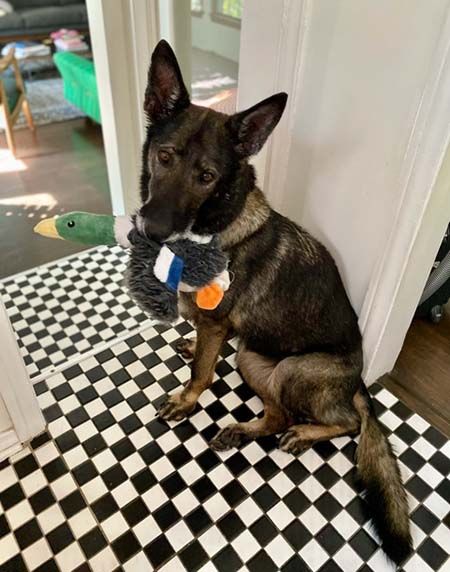 Don’t be fooled by her prematurely grey muzzle — this gorgeous girl is young, probably about 6-7 years old, and has a youngster’s high energy level. She’s highly intelligent and observant, but not inclined to apply her smarts toward nefarious ends. She’ll dismember a squeaky toy or shred a tennis ball within minutes, but will leave shoes and other household belongings unmolested. She’s not much of a barker, and doesn’t get riled up by other dogs’ barking, even ones going ballistic on the other side of a fence or window as she walks past. She doesn’t seem to have much interest in other dogs, but is probably capable of developing a friendship with one. However, that friendship would likely rank secondary to her main passion, balls. This dog is ball-obsessed, so don’t apply for her if you’re not willing to become well-acquainted with a Chuck-it, okay? In exchange, you will get a joyful, loving, loyal companion who will make you laugh every day — a total bargain if you ask us.