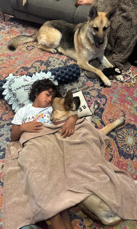 Enzo is a lover boy who delights in being with people! His favorite fan likes to make beds for him and he will oblige by laying down and cuddling- see last pic!