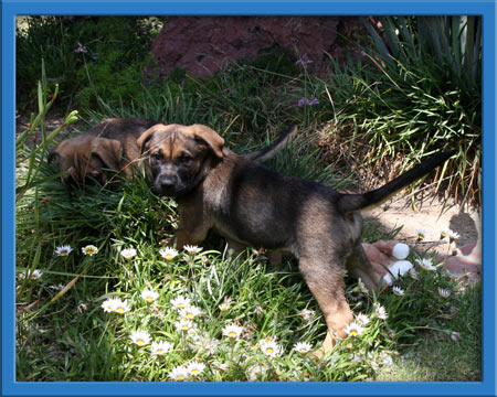 The "E" boys are robust little men, with great appetites and playful personalities. They are very affectionate, outgoing and love the big dogs in their foster homes. They love their toys and to play chase and tackle each other. Like a couple of NFL quarterbacks, they sometimes even seem to be calling plays to each other. When they are not playing they can be found snugged up together sleeping on a dog bed. They are crate trained and sleep through the night, a big plus for puppies their age. They are also doing well with their "potty training". With their whole lives ahead of them, they are free agents looking for a new team to join. Adopting one these boys will be a definite touchdown for your family.