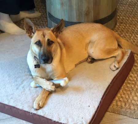 Eve is in a foster home with a family and their 9 year old male German Shepherd. Her foster family describes her as a "turn key" dog. It's obvious that she was well cared for and was taught some basic commands. She loves treats and toys and is very motivated by them. She can sit, shake, and lie down. The only thing Eve would need is some polishing on her leash skills. She may not have been walked on a leash before and she can get distracted by people and other dogs around her. It's nothing that a little training won't help. She is interested in other dogs but has not had a chance to play with many since she had just been spayed before going to her foster home.