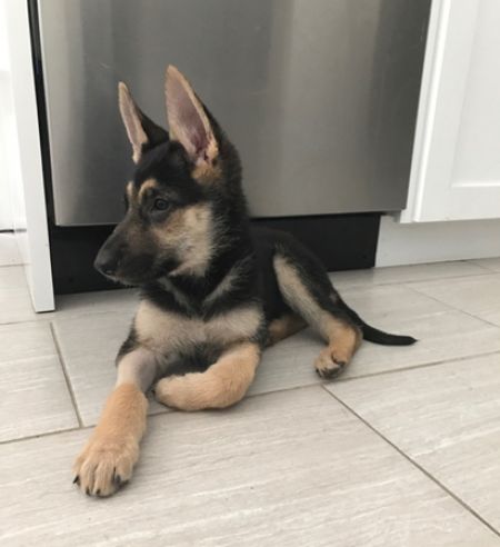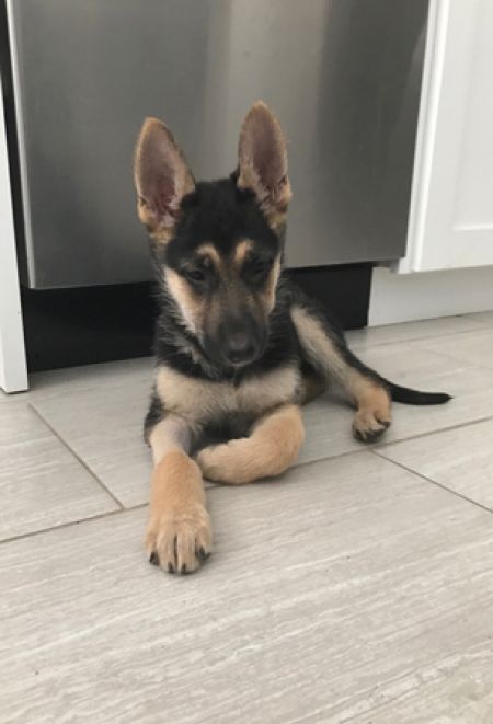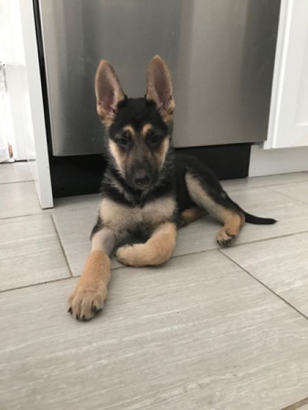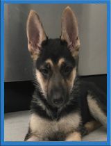 Evelyn is a beautiful 2 month old, black and tan German Shepherd puppy. She and her six siblings were left at a shelter because the backyard breeder had too many puppies and exceeded his limit. One of the litter tested positive for Parvo but Coastal rushed them all to a vet for preventative treatment. They were released after a week to foster homes. Evelyn and her siblings are going to be full sized (~60-70 pounds) GSD.