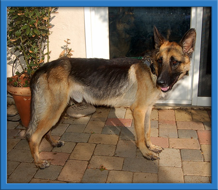 Finnegan is about 2 - 3 years old and a skeleton. Originally believing that his condition was due to being left in a yard unattended for a couple of weeks, we quickly determined that we needed to do some tests to further diagnose his situation. Finn has a digestive condition called "EPI" which means that his pancreas doesn't process food well. Once this is diagnosed and medicated properly, a dog with EPI can live a completely normal life. His food takes some preparation (it has to sit for 20 minutes to absorb the medicine) and he cannot eat treats, dinner scraps.