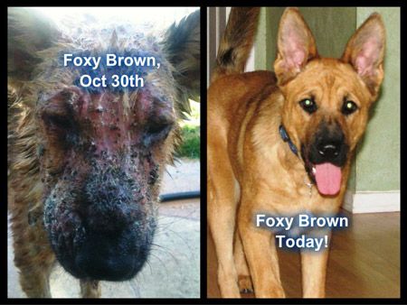 Foxy started off life just like every other puppy. Unfortunately, she wasn't able to fight off tiny, microscopic mites that went untreated and she developed a condition called demodex mange (see before/after pic!) She landed in a high-kill shelter simply because someone didn't want to figure out what was wrong. Thankfully, we were able to find a loving foster home that nursed her back to total health under the direction of one of our trusted veterinarians.