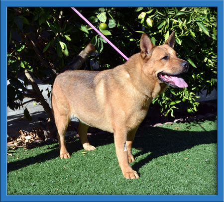 Frankie, mixed with a bit of something else, came to us absolutely frozen in fear. Her caretakers were very worried about her and took extra time to give her attention and confidence. Within days, Frankie came around. This is what we love about shepherds and shepherd mixes! Once they understand that no one is going to hurt them, they are so intelligent and sensitive that they recognize they are in a "good place". Frankie has demonstrated this to her caretakers and now they just call her "fun."