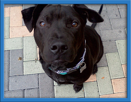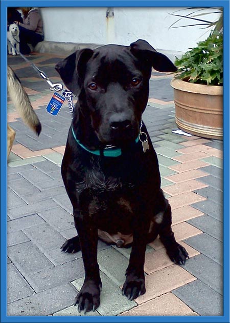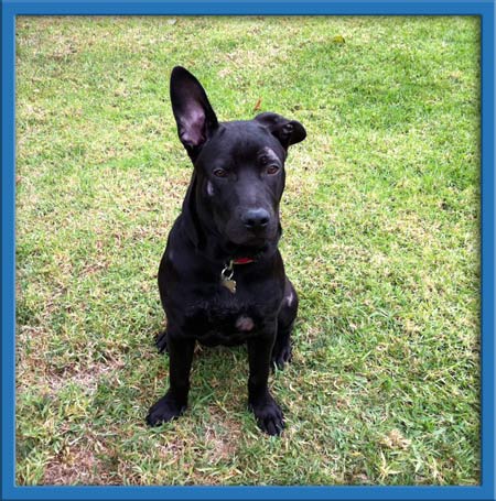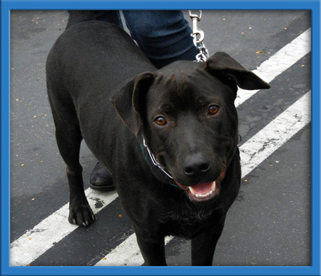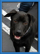 Frankie is a 10 month old black lab/pit mix puppy who was found roaming alone at the dog beach in Huntington Beach. He followed a Coastal volunteer until she realized he had no owners, so she scooped him up and fostered him. To his foster mom's surprise he already knew to go to the bathroom outside and knows how to sit like a champ. He likes to chew on his bones and toys. He has a great disposition and LOVES LOVES LOVES to play with other doggies. He currently lives with a German Shepherd and they constantly play and tire each other out. He is has no food aggression, the foster mom can take a bone away from him and he doesn't care. He will also eat ANY FOOD you give him: broccoli YUMMY, carrots DELICIOUS, zucchini NOTHING BETTER, bananas A DELICACY. Frank is a great hiking dog as well and just experienced SNOW a weekend ago. He also would be a good fetching dog once he learns to give you the ball back. Great dog for a family or a young couple!