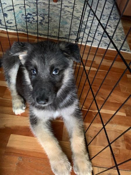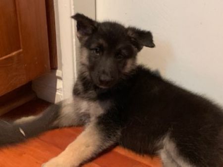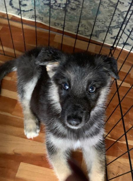 Fred is a two month old German Shepherd and Husky mix puppy. He is super sweet and very cuddly. Fred is very playful and gets along with big dogs. He loves his sister Freda. When they play, he’s less aggressive and tends to rollover on his back with her, but he still play-fights back and wants to keep on going.