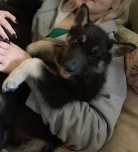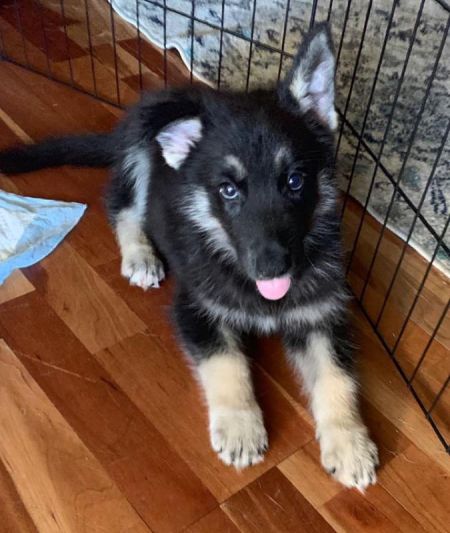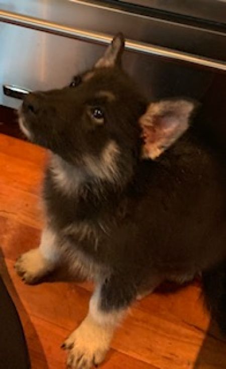 Freda is a 2 month old German Shepherd and Husky puppy. She is very energetic and loves to play and fight with her brother Fred. She tends to start and end the play fights. She seems to be more dominant of the two pups. She does well with the foster's two big dogs and has no fear. She can hold her own with the dogs. She interacts well with people though she is not as cuddly as her brother, though.