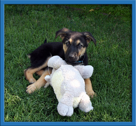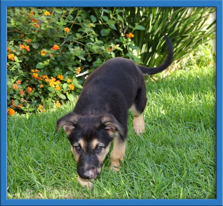 Rescued from a moving owner/breeder with their mom and dad, the "G" girls are happily awaiting their new lives. Fortunately we were able to save this family and it seems like it was in the nick of time. Poor little Gemma was sick and totally emaciated, not to mentioned covered with ticks and fleas. We whisked her straight to the hospital while her big sisters got settled in their foster home. The big girls were covered with ticks as well, but only a little underweight. After a quick frontline treatment and much needed baths, the girls were already enjoying their good fortune. Discovering toys, good food, clean water and much welcomed attention they have blossomed into typical happy puppies. The girls love to play and have quickly socialized with the older dogs in their foster home as well. At approximately 10 weeks old, the "G" girls are more than ready to join their new families and we are currently accepting applications for them.