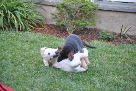 Meet the G litter! They were born in a shelter and they and their mom Ginnie, went into a foster home when they were two days old. Mom Ginnie is a very pretty German Shepherd. We are not sure what the father was. The puppies appear to be German Shepherd or German Shepherd/Lab mix puppies. They have a wonderful temperament and have been socialized with other dogs and older children. They are typical, fun loving puppies who love to play with each other and roll around in the grass. The puppies will be available to adopt after February 5th but we are accepting applications now for this sweet, lovely litter.