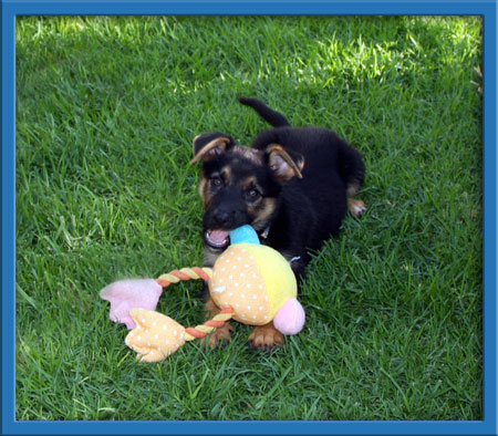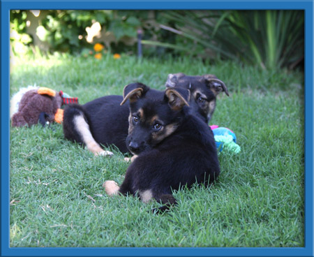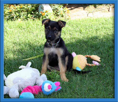 Rescued from a moving owner/breeder with their mom and dad, the "G" girls are happily awaiting their new lives. Fortunately we were able to save this family and it seems like it was in the nick of time. Poor little Gemma was sick and totally emaciated, not to mentioned covered with ticks and fleas. We whisked her straight to the hospital while her big sisters got settled in their foster home. The big girls were covered with ticks as well, but only a little underweight. After a quick frontline treatment and much needed baths, the girls were already enjoying their good fortune. Discovering toys, good food, clean water and much welcomed attention they have blossomed into typical happy puppies. The girls love to play and have quickly socialized with the older dogs in their foster home as well. At approximately 10 weeks old, the "G" girls are more than ready to join their new families and we are currently accepting applications for them.