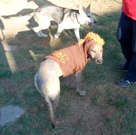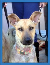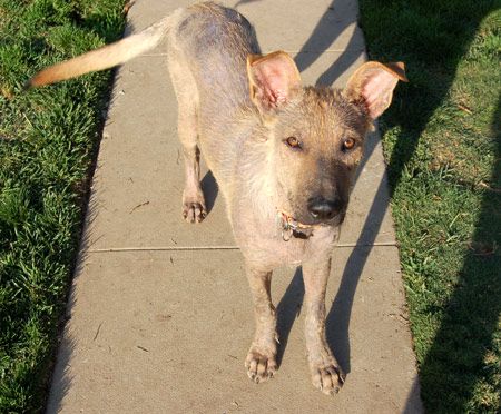 Not even a year old, she is an exuberant young lady who loves to play & cuddle with the best of them. She is very friendly with dogs, a little afraid of men but we are working on that. She is a typical puppy in that she will actively look for trouble and now she's our "Halloween" dog complete with a Mohawk.