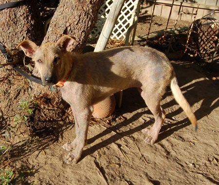 Glitter was discovered at a high kill shelter, hairless, scared and cold. We were able to rescue her and get her straight to our veterinarians, who confirmed that she has demodex mange (non contagious) and she is being treated with Cephalaxin, flagyl and ivermectrin. We are also giving her fish oil caps and coconut oil.