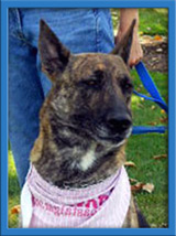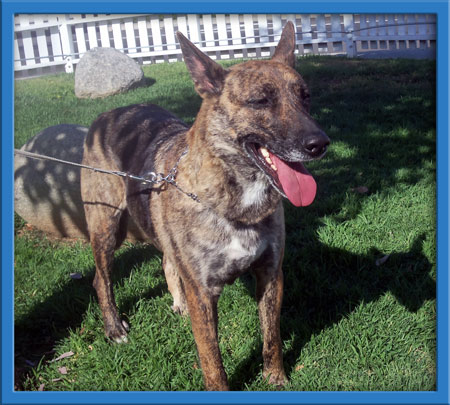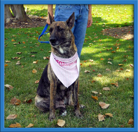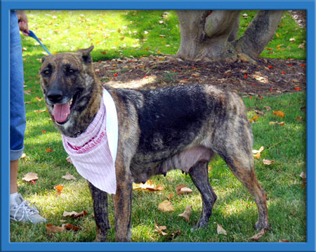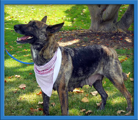 Gracie's shelter picture showed a momma dog laying in a cage with 10 tiny pups. The look on her face was one of despair and gloom. We raced to find a foster home who would care for Gracie and her family while she nursed the pups. The day we picked up Gracie and her litter, the look on her face changed to joy and happiness. Gracie is a delight to be around and a very bright girl! She has raised her 10 babies and they are just about ready to be adopted. Gracie has done her work, now she is ready to be adopted as well! At about 60 lbs, Gracie is a perfect medium sized girl. She has the brindle markings of a dutch shepherd and the shape of a Belgian shepherd. All make for a very smart, well rounded shepherd!