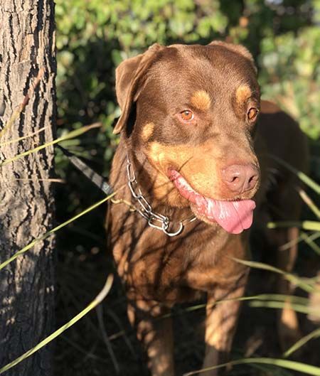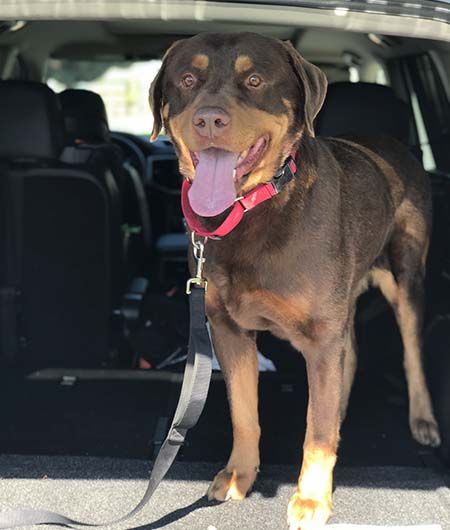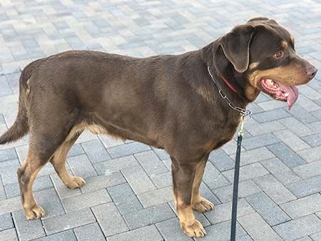 This 93 pound chocolate/liver colored Rottie is easy on a leash and walks well with other dogs. He doesn't appear to have ever lived with other dogs, though, and would need help in order to live in a multi-dog home. He spent time in a home with other dogs and children and, while he was good with the kids, he didn't appreciate the other dogs approaching him. Considering how fearful he was in the beginning, he's still come a long way and just needs someone with large breed experience to take him the rest of the way, but would be happiest as the only dog.
