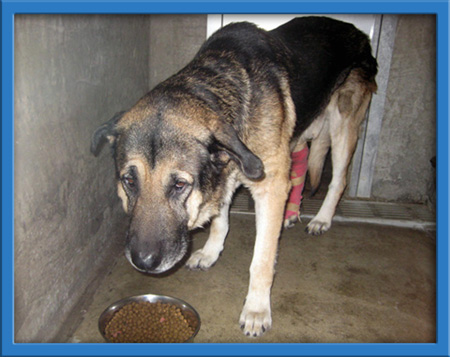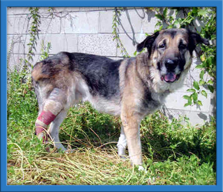 Update: 9/15/09: We have been given some GREAT news this week! Harvey may not need orthopedic surgery as we had originally thought. Harvey is under the care of one of our wonderful vets and has received a new cast, crate rest, pain meds and antibiotics. Because of the location of the break, we are hoping that it heals completely and will be stronger than if he had a surgical repair! That is the good news! We have a little bit of bad news as well. It turns out that Harvey had been neglected for a very long time. His spirit and body is very broken. Harvey does not love to be touched and really doesn't like seeing the vet! He is warming up to us and those that give him love but he really isn't to keen on anyone messing with him. Understandably, he is hurting and had been left to fend for himself for what we believe was a very long time. Harvey's coat and skin was a mess. His ears full of years of dirt and filth. His body riddled with fleas and ticks. While he may not need surgery, he is going to need a lot of tender loving care to get back to the happy dog he should be. Harvey will be revisiting our medical team regularly for therapy and rechecks. We are hoping to have a very happy report on his psychological condition very soon.