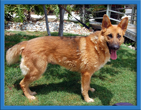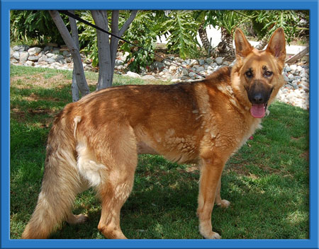 Henna is a striking gal with a coat of the color that we don't often see in German Shepherds. She has a beautiful disposition too! We'll be grooming her and fluffing her up and will take "after" photos". She also has a gorgeous thick tail. Henna does great with other dogs, walks nicely on a leash and has a calm personality.