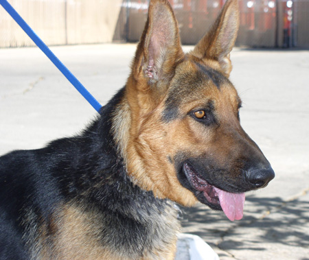 Hondo appears to be young, probably around 12 - 18 months old. He's a stunning red and black male. He seems to get along with other big dogs.