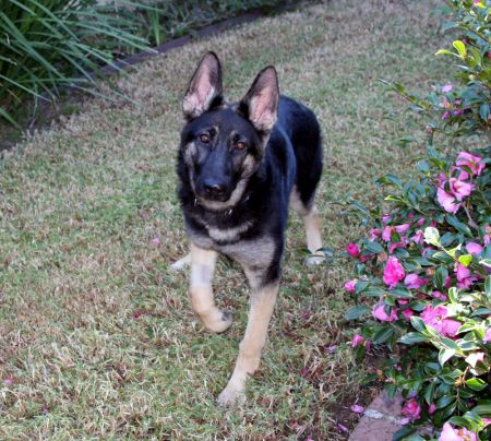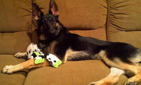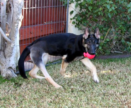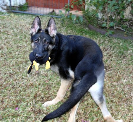 Hope is a very special 6 - 7 month old German Shepherd puppy. This beautiful girl had quite a rough start. Somehow when she was about 4 weeks old, her right femur was broken and her owners never bothered to take her to the vet to get it treated. As a result, not only did hope not learn to walk properly, the unset break started to heal poorly causing a condition was quadricep tie down, where the muscles in her thigh lock up and she can't bend her leg much. Hope came to us at 8 weeks, unable to walk properly and really needing our help. She has received surgery and therapy to help her develop her mobility and even though her right leg doesn't work "normally" it doesn't hold her back. She is a typical, active happy puppy in every way.