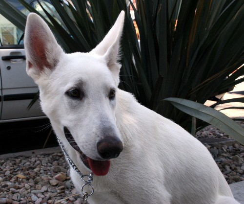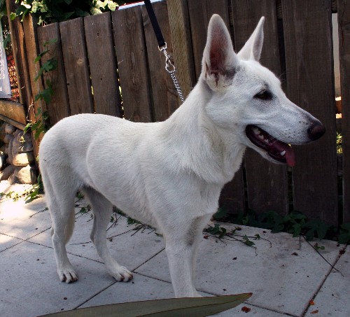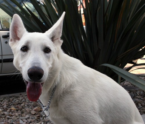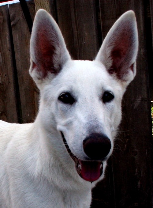 This petite white young lady has some growing to do if you take a good look at her paws and ears. While her shelter papers indicate that she is two years old, by the looks of her teeth, paws and ears, we are all guessing that she is about 10 mos old. She should weigh around 70 lbs when she reaches full maturity. She is an absolutely beautiful white shepherd.