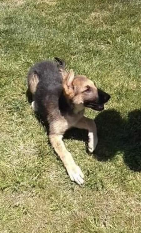 Isa was rescued after a breeder let her go because of an umbilical hernia. Another rescue in the area asked Coastal GSR to find her a good home. Isa is adorable. She is 2-3 months old and her ears are starting to stand straight up. Though she is the cutest thing ever, she has a very strong will and can be quite stubborn, even for a GSD pup. She currently lives in a foster home with another dog and cats. She rules the roost over the people, dog, and cats.